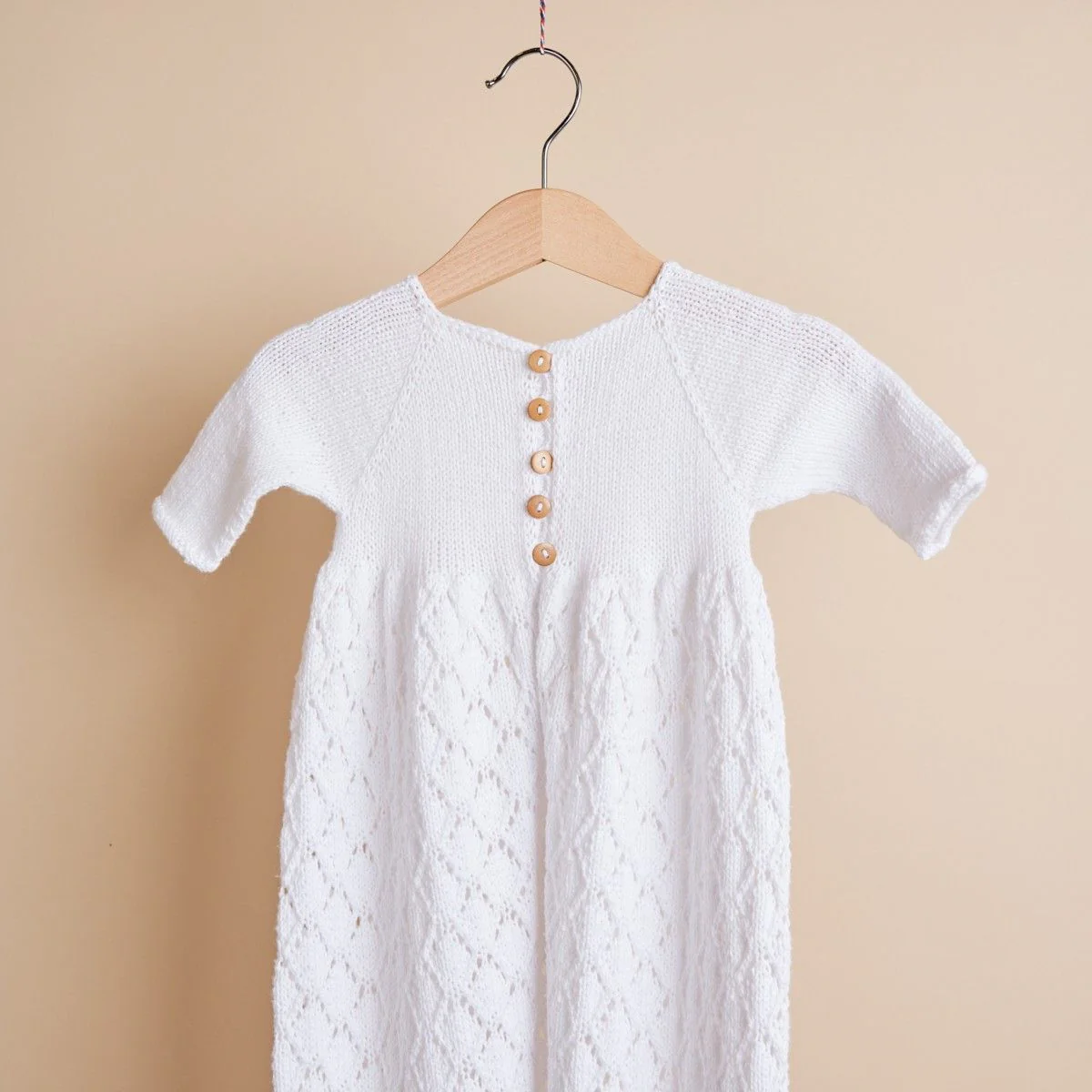 The christening robe is knit from the top down with raglan shaping. The dress is open all the way down the back and closed with buttons.