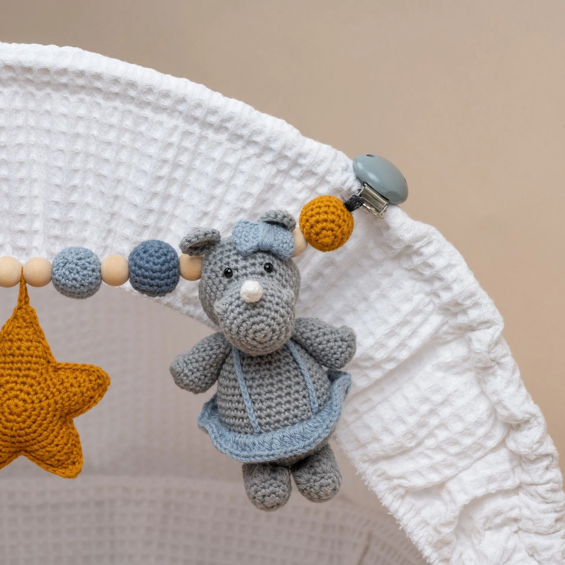 Now you can crochet the rhinos, Hollie and Herman, as a pram chain. It’s crocheted using Rainbow Cotton 8/4 in lovely colors, but you can choose exactly the colors that will look best in your pram ;)