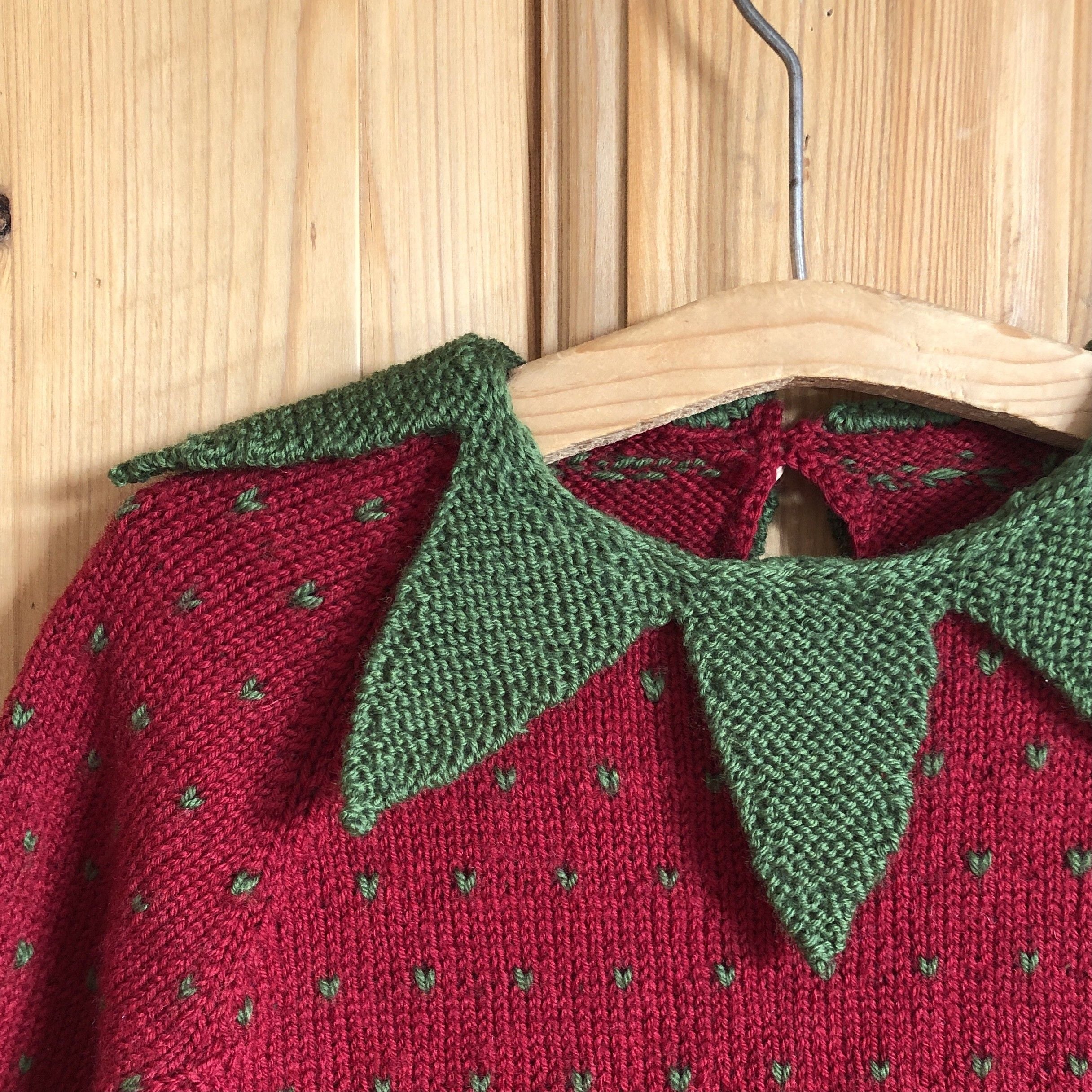 The sweetest strawberry dress worked bottom-up with lice stitch and raglan decreases. The dress features a garter stitch collar and a slit at the back of the neck. The edges are folded.