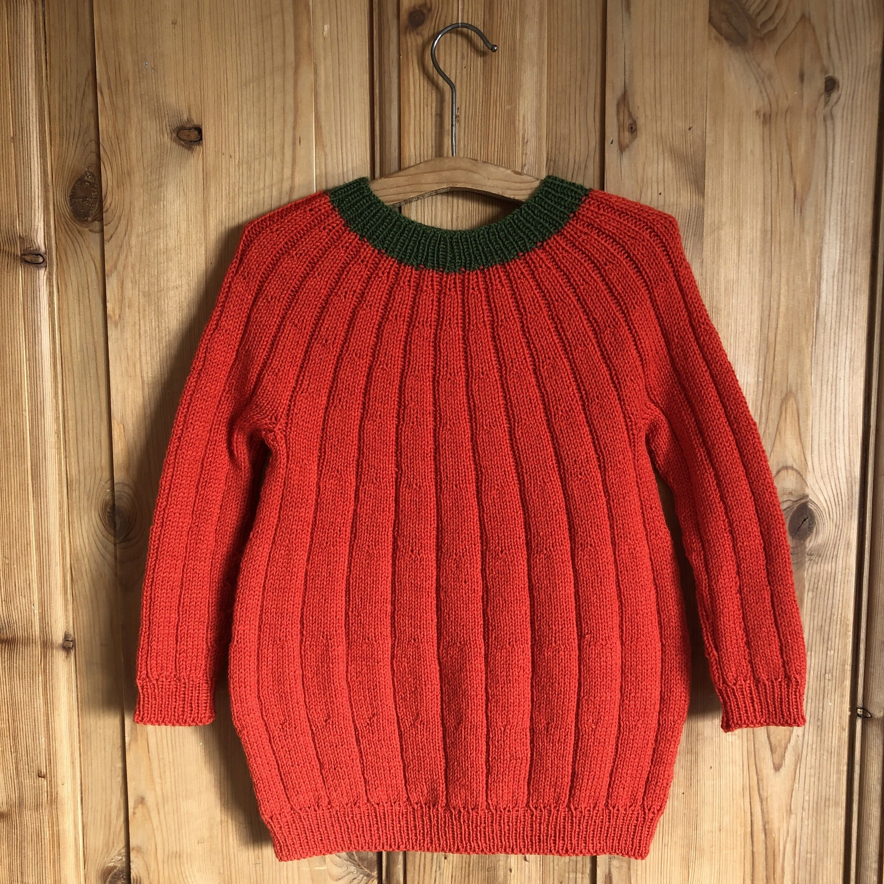 The dress is worked top down in rib pattern, resulting in a pumpkin-like look. The edges of the dress are worked in 1x1 rib, and the neckline (the pumpkinβs stalk) is worked in green. The dress is fairly simple to knit.