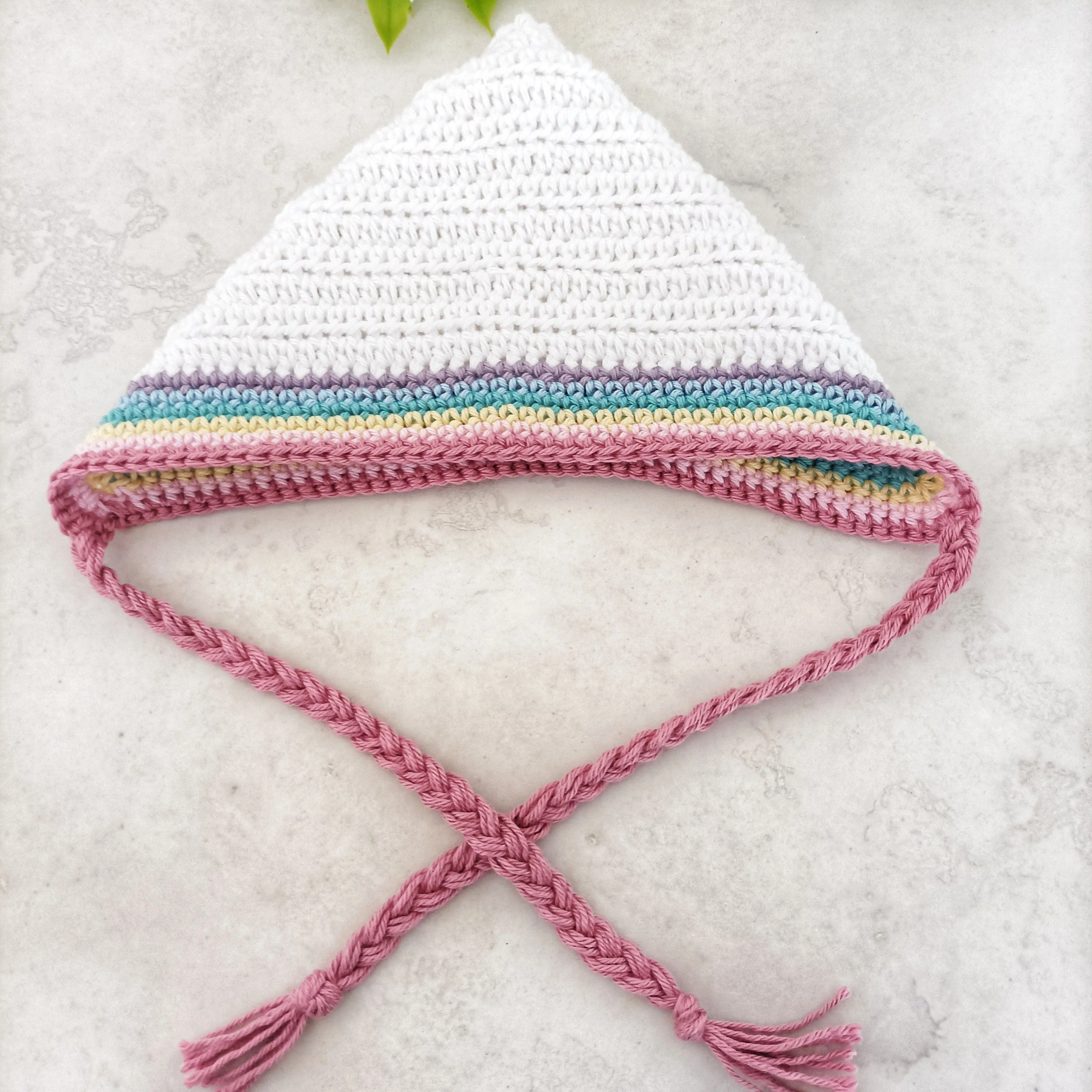 This bonnet is made by crocheting a rectangle in white, then folding in half and sewing up the first row to make a pixie style bonnet. Then adding an edging of rainbow colors.