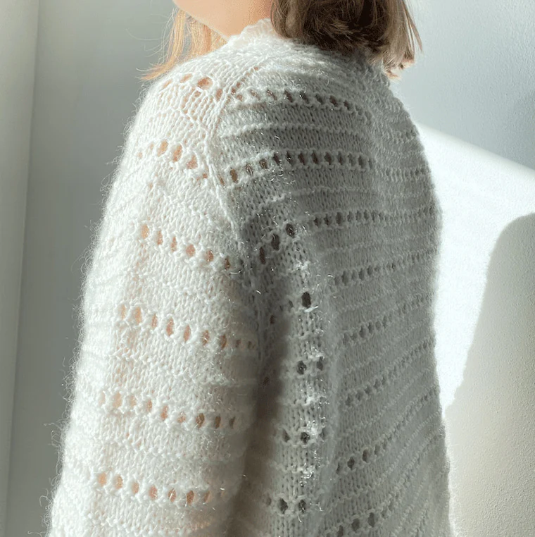 The Easy Spring Blouse has a feminine shape created with saddle shoulders and a short turtle neck. The blouse is worked from the top down in a simple, beginner friendly hole pattern. The combination of the hole pattern and the airy yarn alternatives creates a light and airy blouse - perfect for spring and summer.