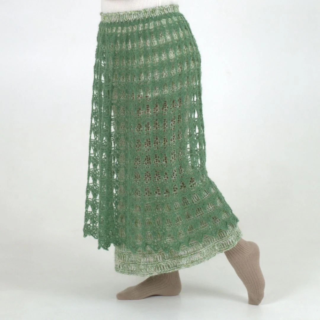 This skirt is built around your hips, so choose your size by hip measurement for the best fit. Both layers grow from the same waistband and are meant to live together as one finished piece. The underskirt feels soft and warm against the skin, while the lace overskirt brings movement and character into every step. With its light, open texture, the skirt is slightly sheer and designed to be styled with your favourite layers. Worked top-down, the pattern invites you to stop at the length that feels right, not the one the pattern tells you to.